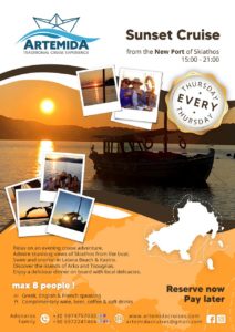 A unique experience in the natural beauties of Skiathos Island. Visit the deserted islands of Tsougria and Arkos, visit the cave of Fonissa, the enchanting Lalaria*, the Skiathos Castle* passing between the castro islands, the small paradise of Kechria, the famous Tarsana, the small and the big Asselinos, Agia Eleni and Banana making the round of Skiathos with the countless golden beaches. Enjoy the wild beauty of the north side of the island that remains unexplored as you cannot reach it by any other means other than a boat.